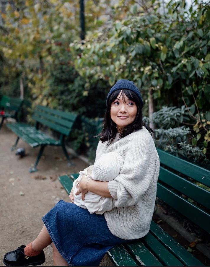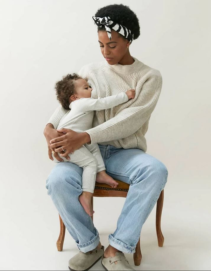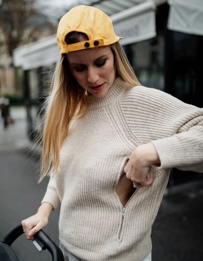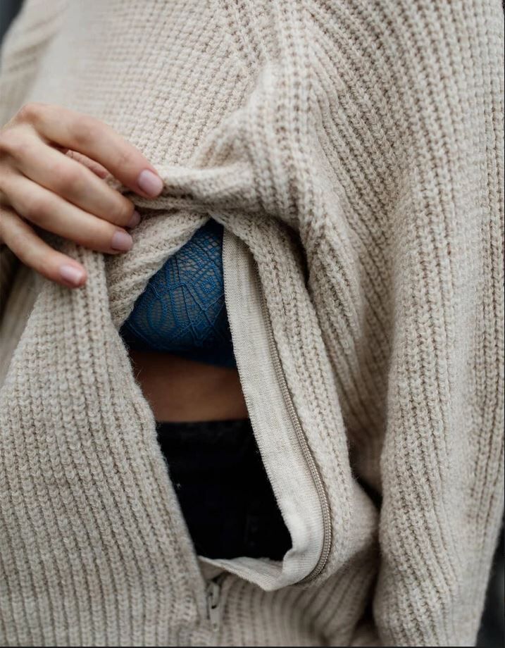 Een beige voedingstrui, met liefde gemaakt in Italië. Het gaas is dik genoeg om de koude momenten door te brengen en overal en altijd borstvoeding te geven. Je hoeft je niet meer bij -10 graden uit te kleden om je baby te kunnen voeden 🥰