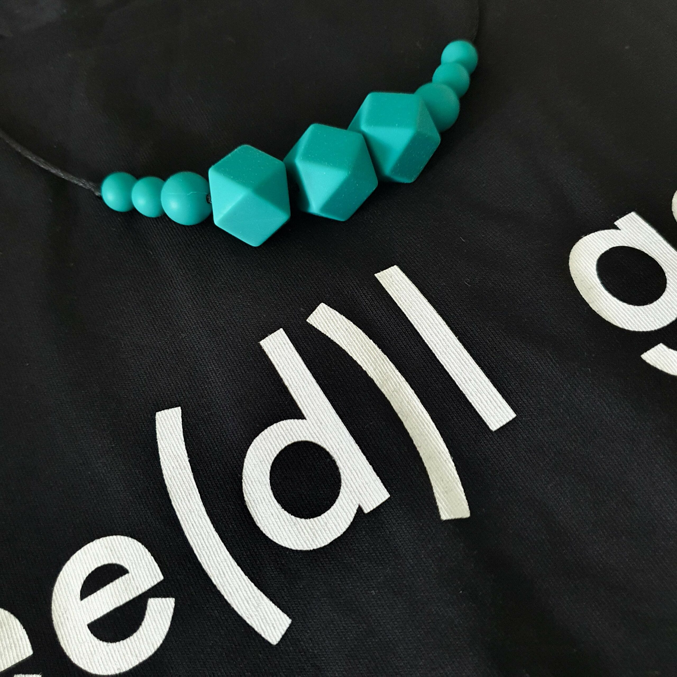 Deze 65-70cm lange ketting is een bijtring, voedingsketting en draagketting die door mama (of papa!) gedragen wordt.