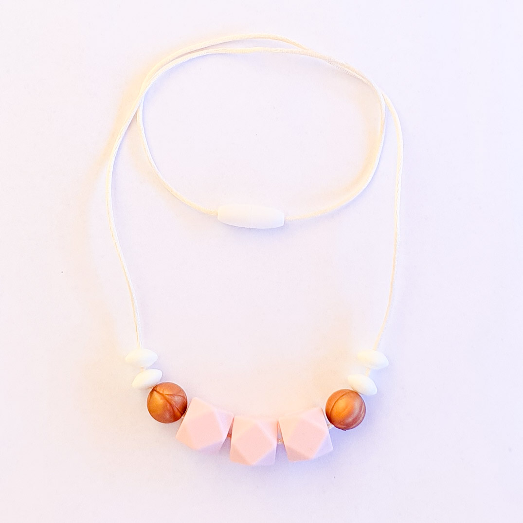 De ketting bevat 100% siliconen kralen en de koord is volledig van satijn met een zandkleur.