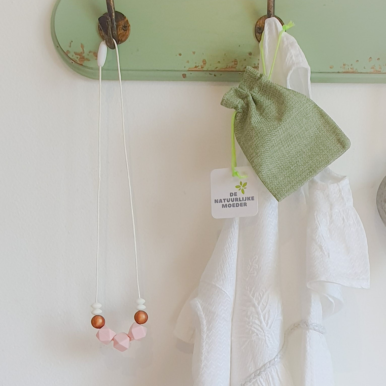 Deze 65-70cm lange ketting is een bijtring, voedingsketting en draagketting die door mama (of papa!) gedragen wordt.