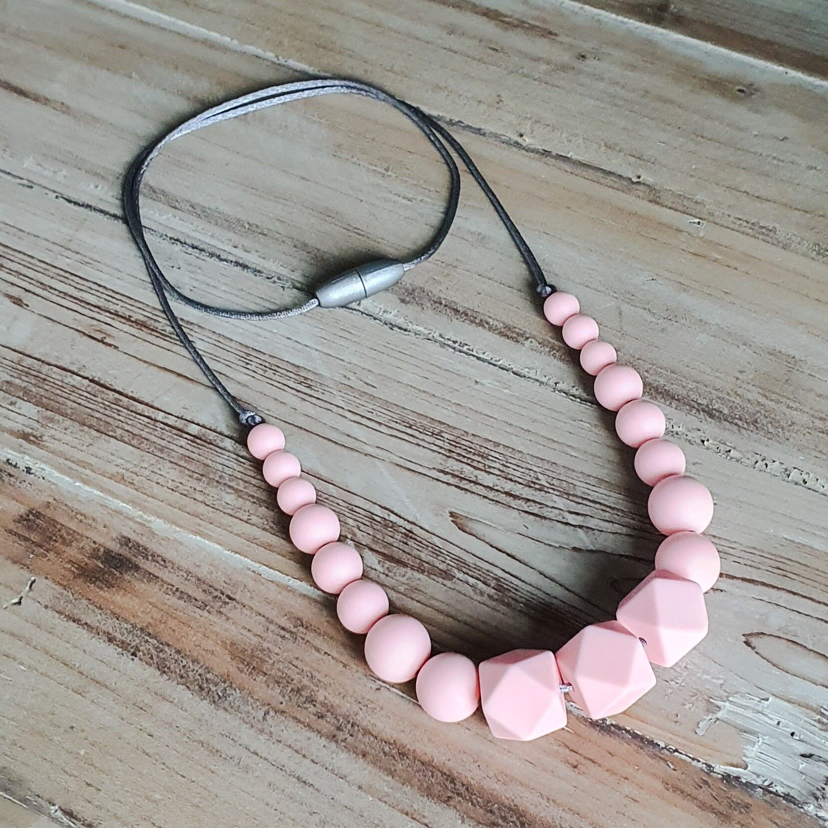 Deze 65-70cm lange ketting is een bijtring, voedingsketting en draagketting die door mama (of papa!) gedragen wordt.