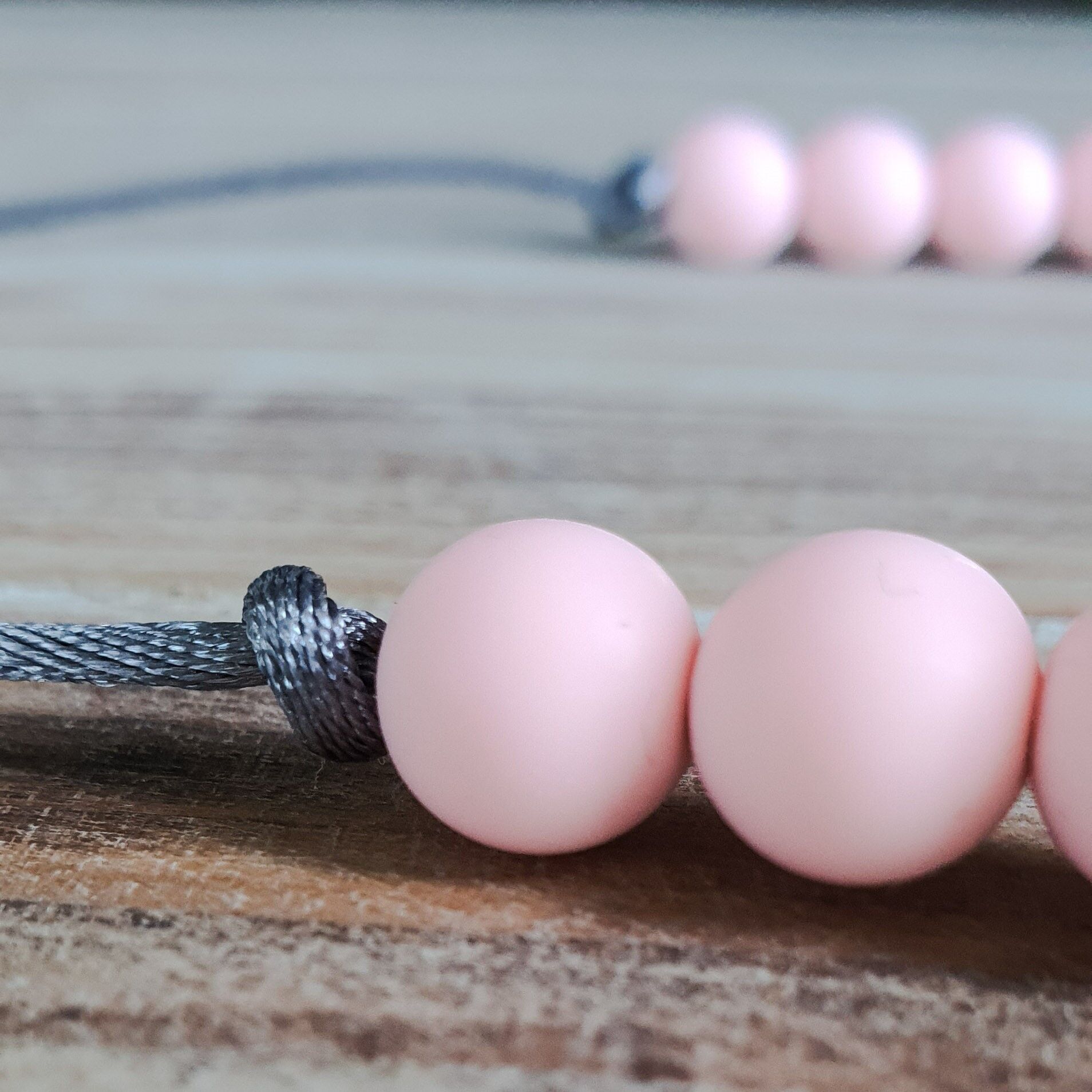 De ketting bevat 100% siliconen kralen en de koord is volledig van satijn met een zilverkleur.